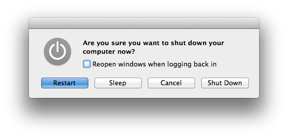 The Solution: when you open the shut down dialog, by pressing control + eject, there is a checkbox regarding whether the operating should return the computer to its state prior to shutdown. Unchecking that option and restarting solves the problem.